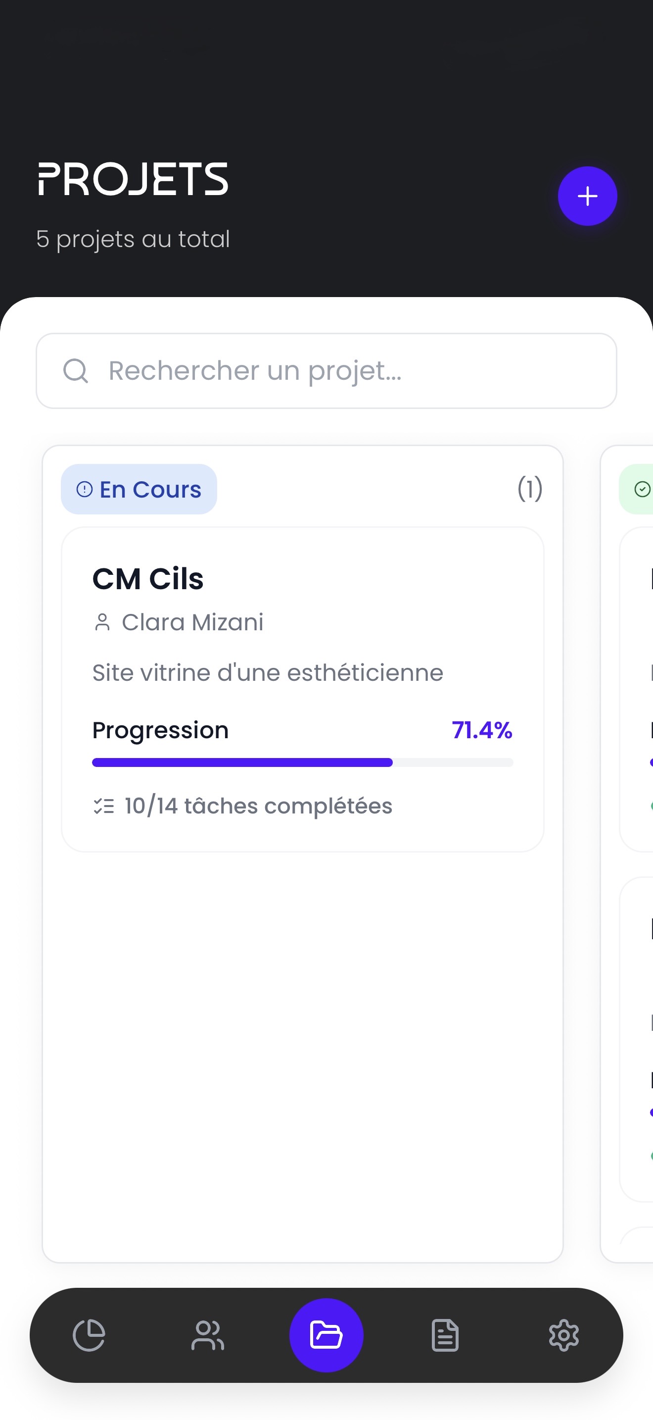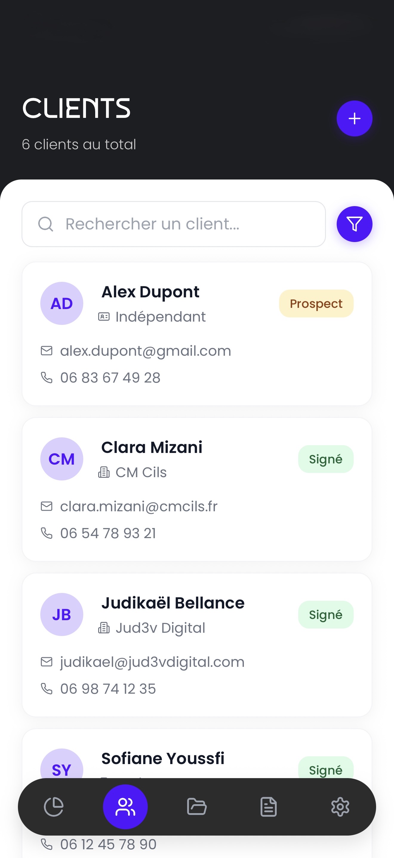 De la prise de contact à la signature, chaque interaction est centralisée. Ajoutez des informations, liez des projets et gardez l’historique complet de vos échanges. Prospects, clients actifs ou archivés : tout est organisé, sans effort.