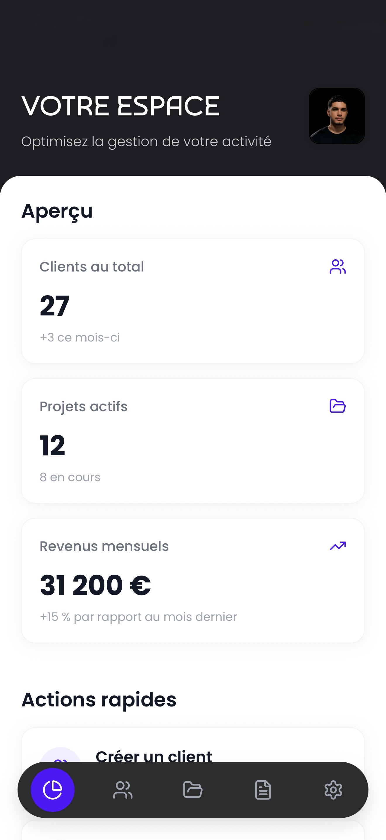 Gestion des clients, création de devis et factures, suivi de paiements, gestion de projets en Kanban, relances automatiques et tableau de bord complet.